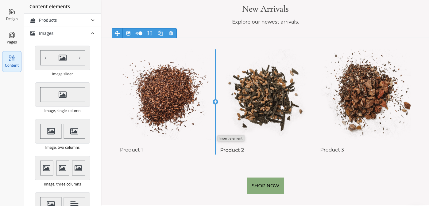 Use case: A merchant is working with a three-column content element. After editing images and text, they realize they’d like to add a fourth image. With the new editor, they can simply add a fourth column without losing any progre